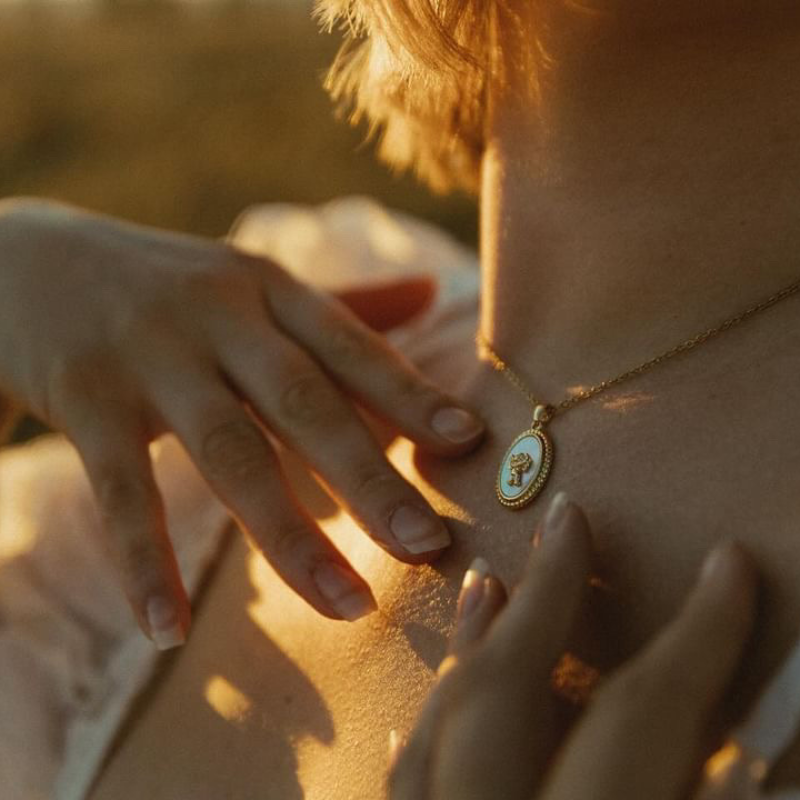 A unique gold plated Oval pendant with a baby angel sat upon a gorgeous pearl background. It is simple and beautiful. Held by a titanium and metal chain they are the perfect necklace to vamp up that Boho Outfit.