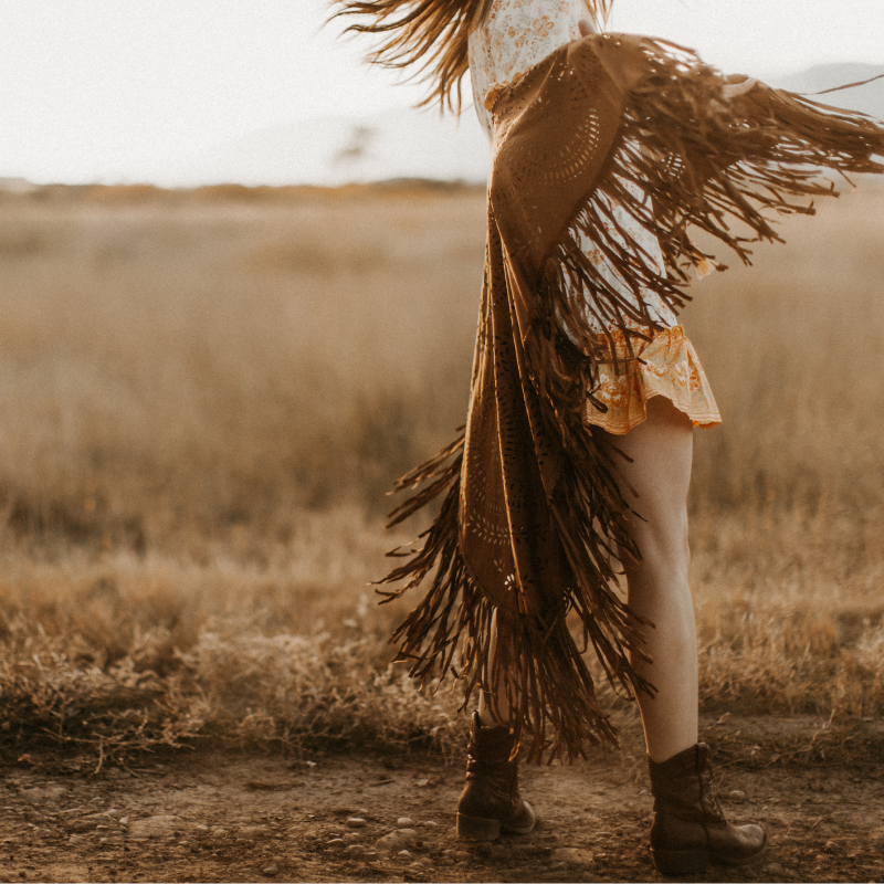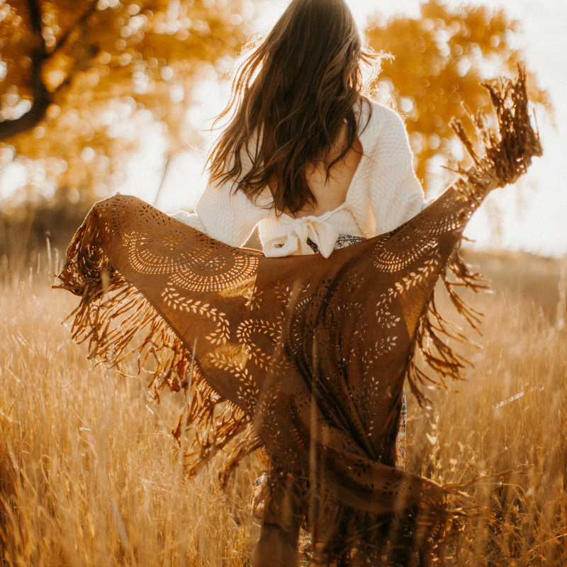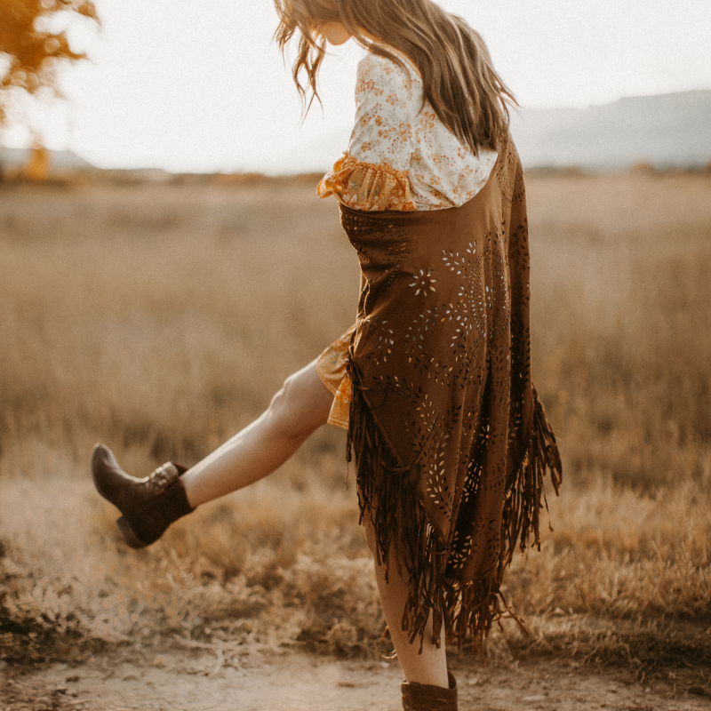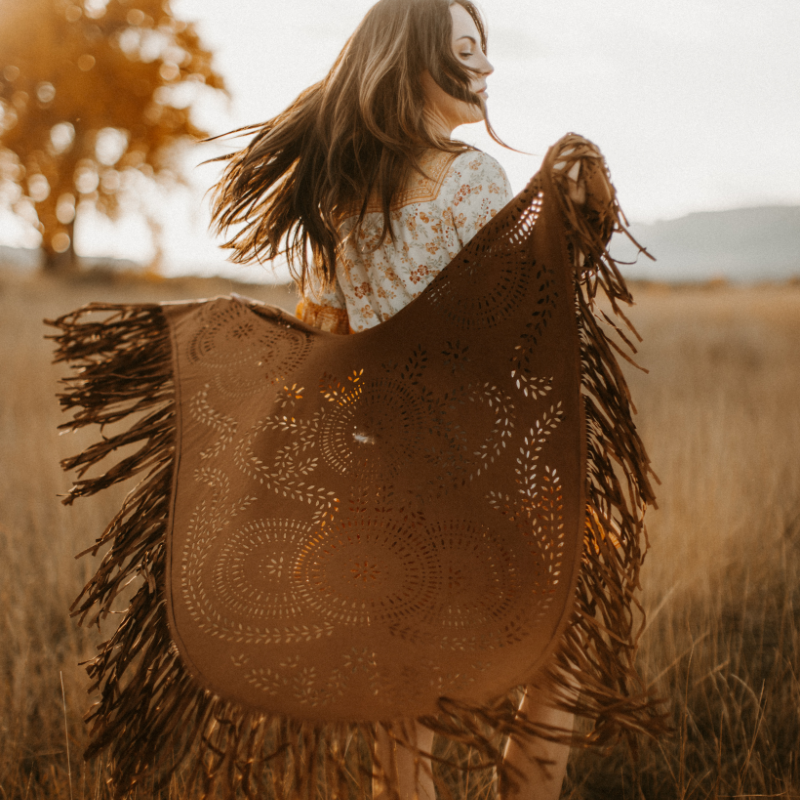 This one size fits most Bohemian inspired sand shawl. Features Off the shoulder shawl with individual tassels across the back and arms. Soft fabric featuring beautiful leave style cut out pattern. Throw this over an existing outfit and your bohemian style is good to go, The perfect piece for your Tribal wardrobe.