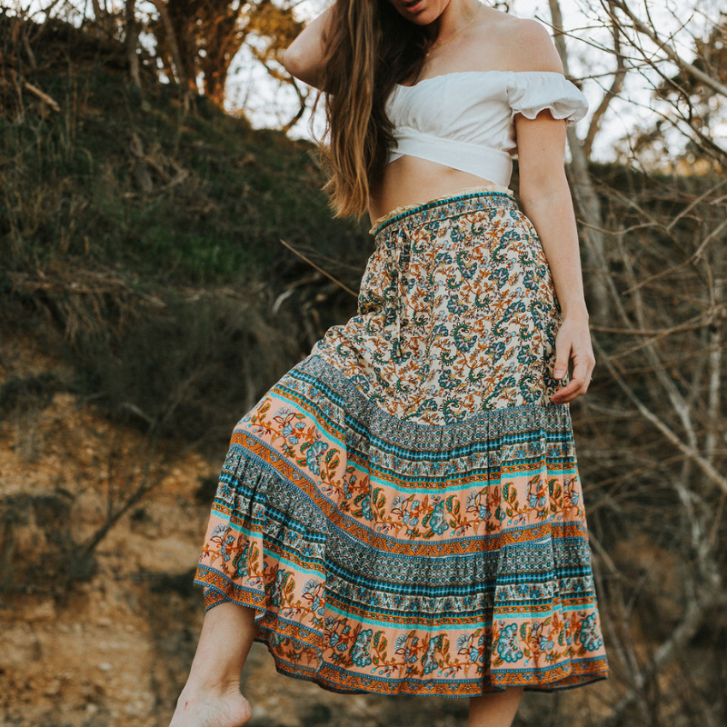 Introducing our stunning Paisley Bohemian Skirt, featuring a vintage-inspired floral design that embodies the essence of Bohemia. It's long, flowy material exudes Boho chic, capturing joy and music effortlessly. Available in two vibrant colors, this midi skirt is a must-have addition to your closet. Pair it perfectly with our Nya Rose Crop Tops for a complete ensemble. Experience the allure of Boho fashion like never before.