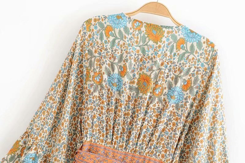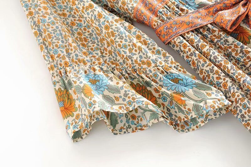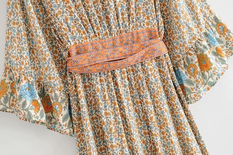 This V neck Sunflower Floral Kimono has a sweet swing to its bell bottom Flare design. A Boho style, that can be worn as a kimono or a maxi dress. Its soft Viscose material, 3'4 length sleeves and a gorgeous lace up adjustable empire waist. We think this is a must for any boho wardrobe.