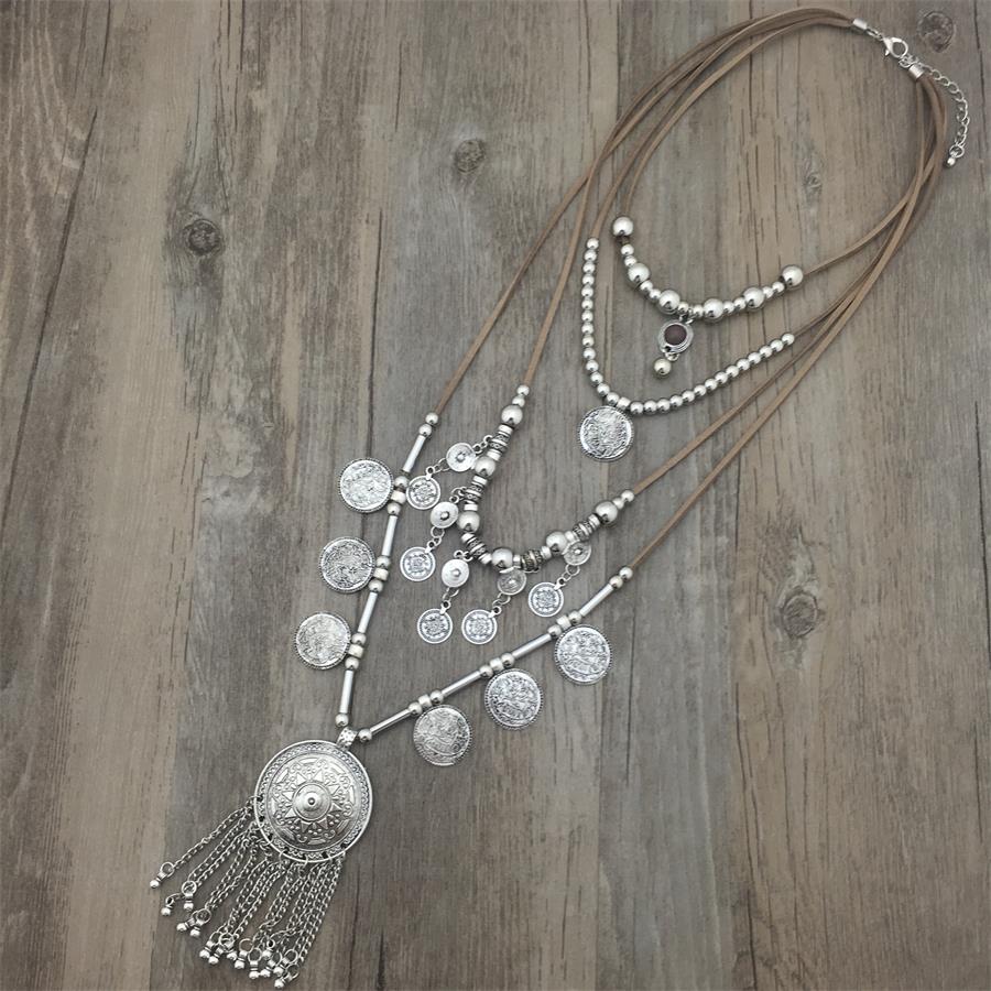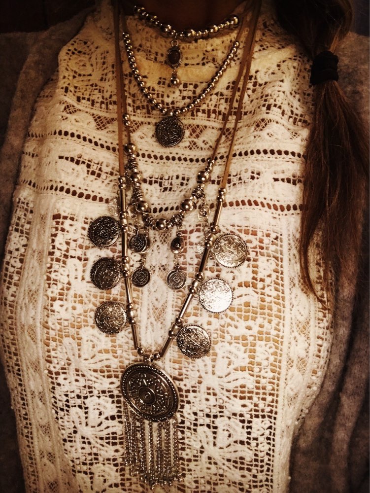 A multi layered handmade Tribal Necklace complete with coins and a large circle plate pendant. All attached by soft gentle Leather on perfectly entwined strings, starting as a chocker down to a long dynamic statement piece. Please see size under Details Tab